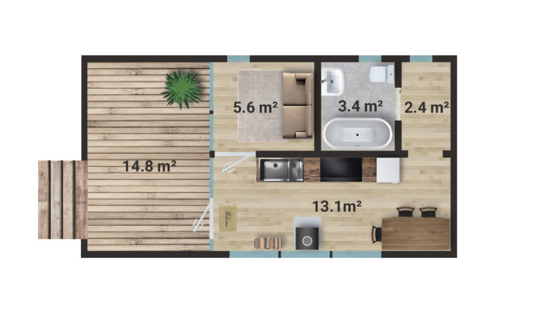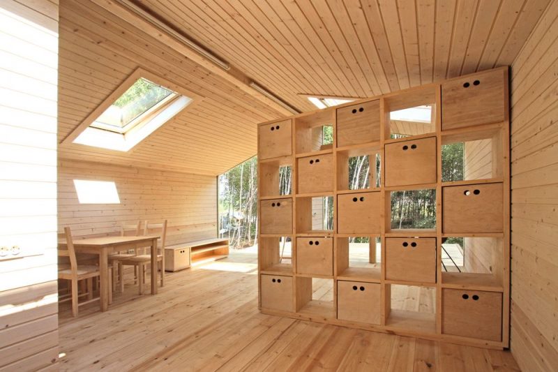 - Продольные стены модулей (стены и потолки, расположенные вдоль конька): имитация бруса 20х195мм, сосна, сорт АB; покраска: Аквалазурь EUROTEX, цвет: белый.